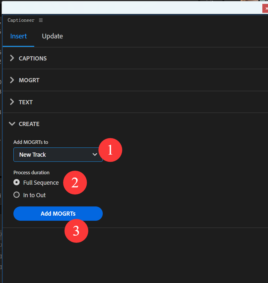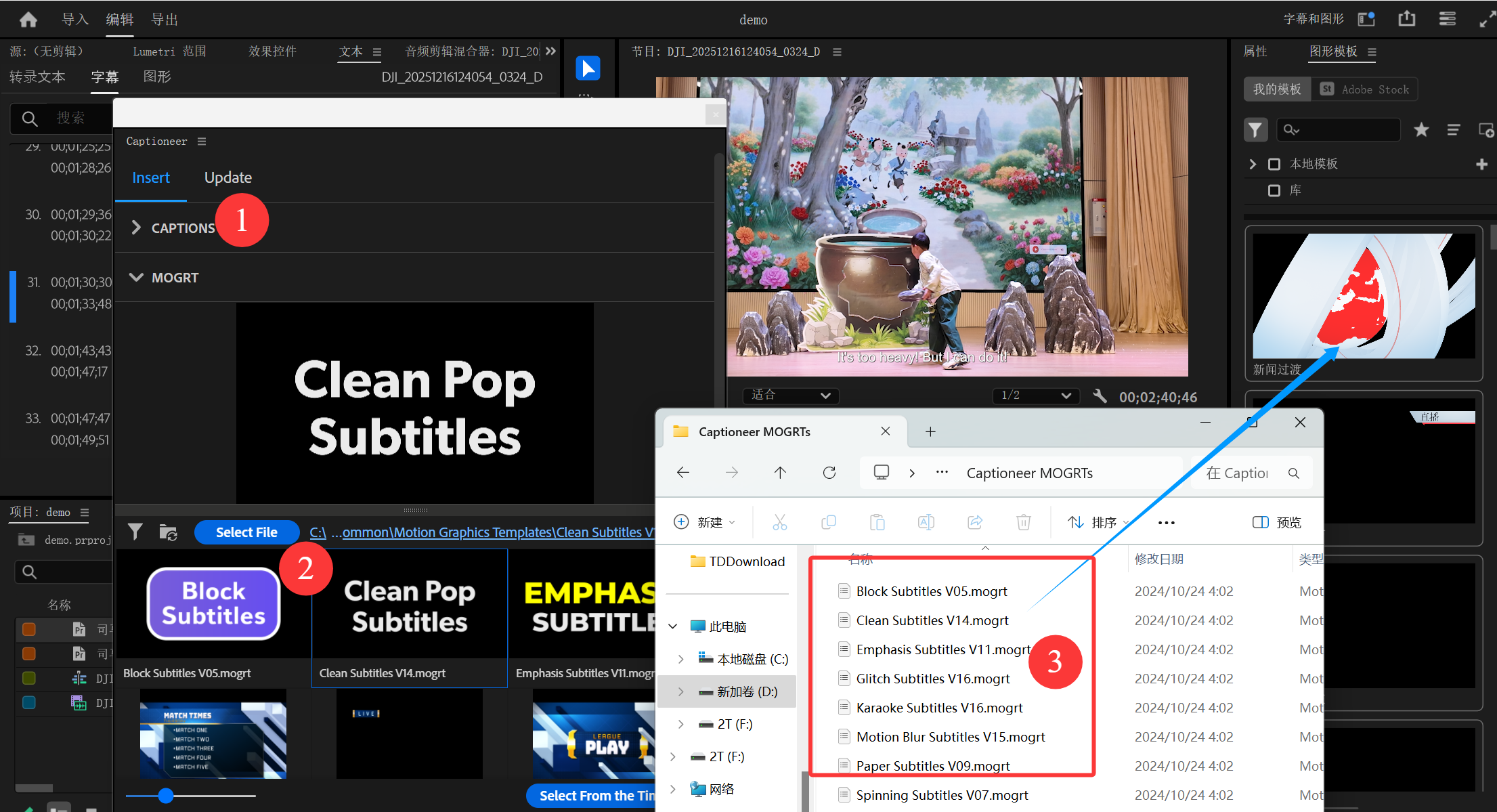 打开插件,选择Morgt。 如果 Morgt没有自己想要的,可以在Captioneer窗口中选择单个Morgt File。 当然,也可以批量导入(见下图第三步,选中多个文件后拖拽到右侧图形模版区域)